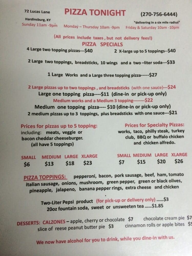Pizza Tonight Hardinsburg Menu (Update 2025)